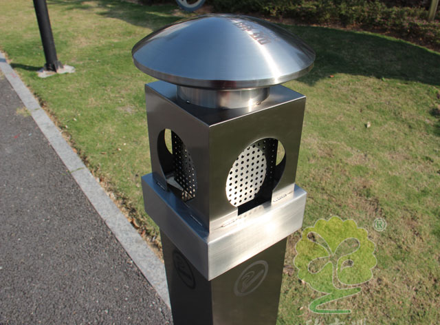 C618室外街道滅煙柱采(cǎi)用優質不(bú)鏽鋼剪(jiǎn)切、組裝、焊接、絲印而成,它包括外套管(guǎn)、支座、內套管、煙灰盒、底(dǐ)座。外套管的底端固定連接在支座上,外套管的側壁上設有煙蒂置入口,內套管(guǎn)用於集中收納從外套管的煙蒂置入口投入的煙蒂,內套管設在外套管的(de)內管腔中,內內套管的開口端(duān)朝上,煙蒂(dì)置入口與內套管的開口相連通,以使得從煙蒂置入口投入的煙蒂可從內套管的開(kāi)口端落入到內套管的內管腔中(zhōng);