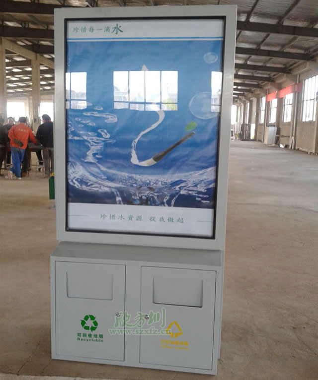 公益廣告垃(lā)圾桶生產製作常用的材質有冷軋鋼、不(bú)鏽鋼(gāng)、玻璃鋼;產品造型經典時尚,整體結構牢靠,箱體箱底連體式設計,底座可固定地上,抗打擊,抗風力。控製箱體高度,廣告桶高度設計在1.8米左右,符合城市(shì)規(guī)劃要求。獨特的抽(chōu)屜(tì)式斜插內(nèi)桶減輕環衛工人(rén)清理勞動強度,投口與清理口一體設計,便於垃(lā)圾入箱及清理。廣告垃圾(jī)箱具有投(tóu)入成本低,直接受眾效果好。