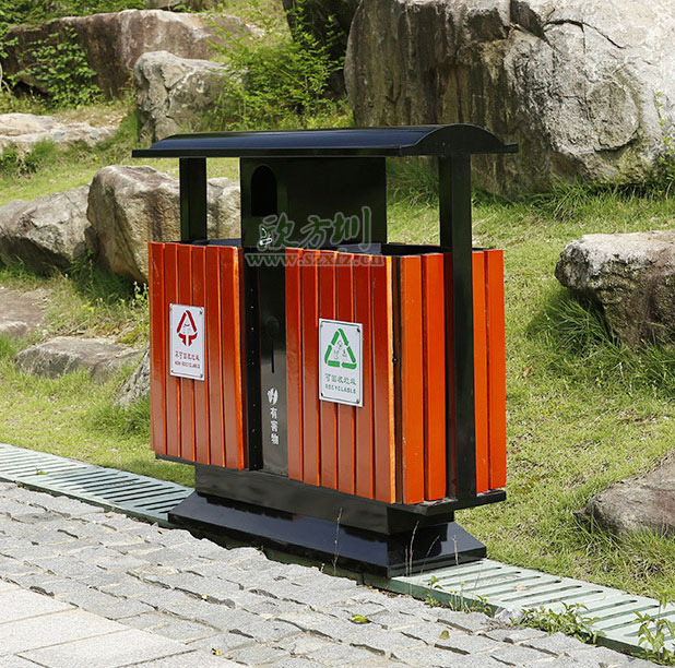 鋼木木(mù)條垃圾桶都是采(cǎi)用的防腐木材質製作而成,例(lì)如這款欣方圳的G97戶外鋼垃圾桶,其(qí)木材常采用(yòng)鬆樹樹種,但是在做成成品之前,木材均要經過防(fáng)腐藥(yào)水(shuǐ)浸泡,烘幹(自然晾幹或(huò)是高溫烘幹),噴漆等工藝,經過這(zhè)些工藝的製作,使傳(chuán)統一般的木材變得具有(yǒu)很好的(de)防腐蝕性和防潮的功效。