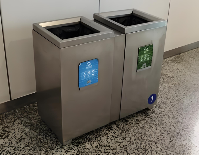 傳統單桶垃圾桶在(zài)地鐵(tiě)站(zhàn)場景(jǐng)中存在容量不足、分(fèn)類混亂等(děng)問題(tí),而兩連體設計通過結構創新解決了這(zhè)些痛點: