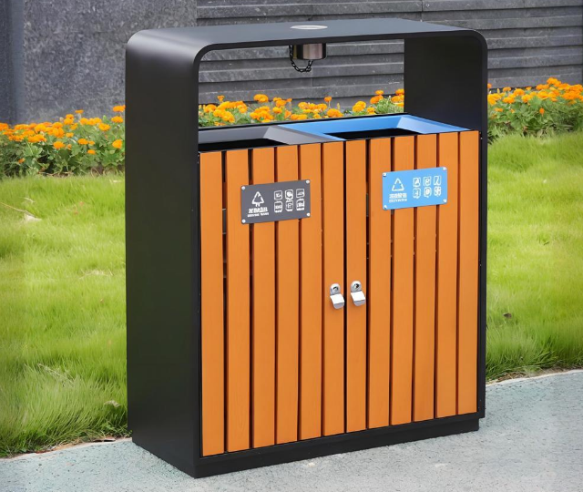 鋼木結構垃圾桶的(de)核(hé)心競爭力(lì),源於其材質組合的互(hù)補性。鋼材(cái)骨架賦予(yǔ)產(chǎn)品極高的(de)抗壓性、耐候性和防盜性能,能夠抵(dǐ)禦戶外環(huán)境中風雨侵蝕、溫差變化及(jí)人為破壞。冷軋鋼(gāng)板(bǎn)經防鏽噴塗或氟碳烤漆處(chù)理後,使用壽(shòu)命可達10年以上,尤其適合人流量大(dà)、管(guǎn)理難度高的公共場所。而實木或防腐木飾麵的加入,則柔化了金屬的(de)冰冷感,木紋的天然肌理(lǐ)與園林中的植被、石材形成視(shì)覺呼應,實現工業製品與自然景觀的無縫(féng)融合。