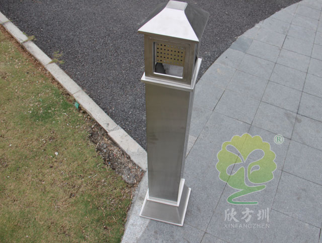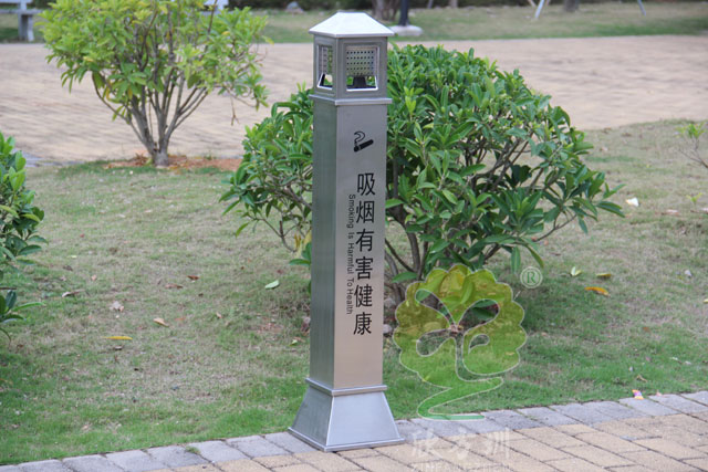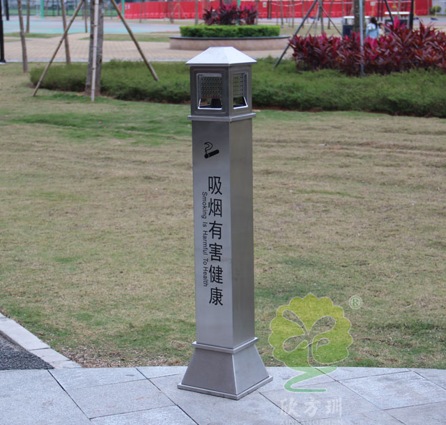 C631公共場所滅煙柱采用優質不鏽鋼剪切、組裝、焊接、絲印而成,不鏽鋼具有很好的堅固耐(nài)用(yòng),防水防(fáng)鏽(xiù),時(shí)尚美觀作用。它包括外套管、煙灰投放(fàng)口、內筒、煙灰盒。外套管的底端固定連接在支座上(shàng),外套管的側壁上(shàng)設有煙蒂置入口,內套管用於集中收納從外套管的煙蒂置入口投入(rù)的煙蒂,內套管設在外套管的內管腔中,內內套管(guǎn)的開口(kǒu)端朝上,煙蒂置(zhì)入口與內套管的開口相連通,以使得從煙蒂置入(rù)口投入的煙蒂可從內套管的開口端落入(rù)到內套管的內管腔(qiāng)中。