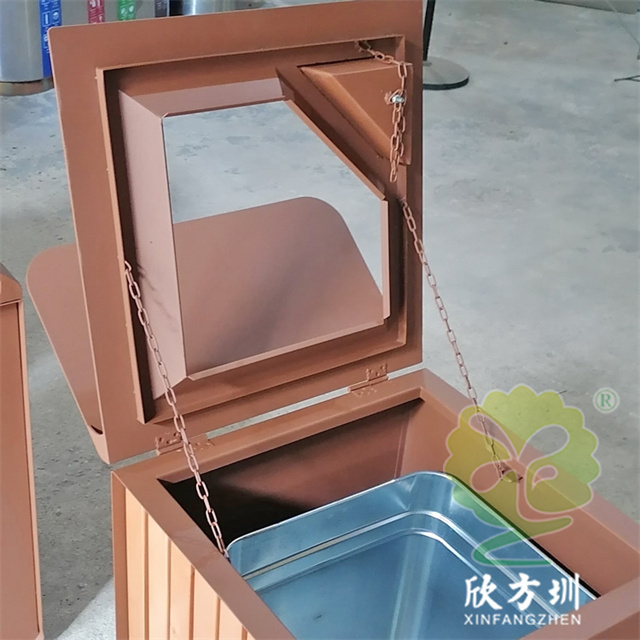 戶外貿易方(fāng)形不鏽鋼果皮箱單筒用201#不鏽鋼1.0厚度板生產,蓋子2.5mm厚度不鏽(xiù)鋼板製作,蓋子坡麵擋(dǎng)雨棚,外框噴(pēn)塑烤漆巧克力色,正麵的細紋不印(yìn)了,用戶要求做純色即可,左右側做了凹進去的效果,左側嵌入(rù)木條,右側金屬麵黑色油墨英文字母絲印。