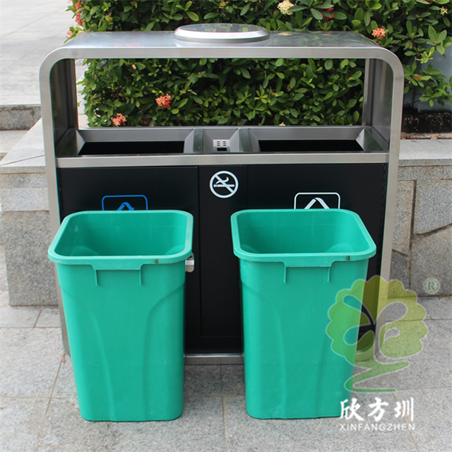 戶外市政街道不鏽鋼分(fèn)類垃圾桶可以采用201不鏽鋼或(huò)者304不鏽鋼板(bǎn)製(zhì)造,頂部中心位置凸起出是這款桶創意方形兩連體設計,正反麵油墨絲網印刷最新國標精品网站999www標識和禁煙標識,側麵可以定製絲印企業logo,垃圾桶兩個方形投口中間位置帶滅煙盒,帶三角鑰匙開門方便環衛工人清理內置(zhì)廢物。