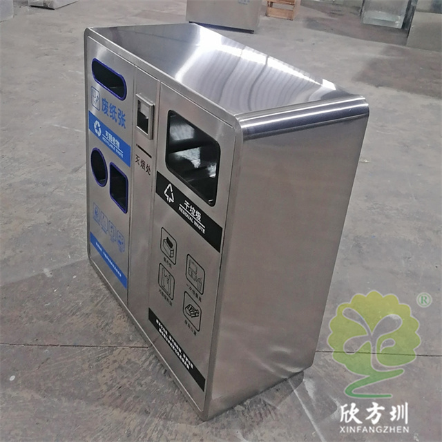 戶(hù)外大容量城市街道不鏽鋼精品网站999www垃圾桶可以采用201/304不鏽鋼板製造,表麵烤漆噴塑了就可以(yǐ)做鍍鋅板(bǎn)材質的,雙麵可回收物多個投口設計,有長方形廢報紙(zhǐ)、方形投口、圓形塑料瓶投口,方形幹(gàn)垃圾投口,投口膠條(tiáo)封邊(biān)防止(zhǐ)割手,中間位置帶滅煙盒,投口(kǒu)顏色可以定製。