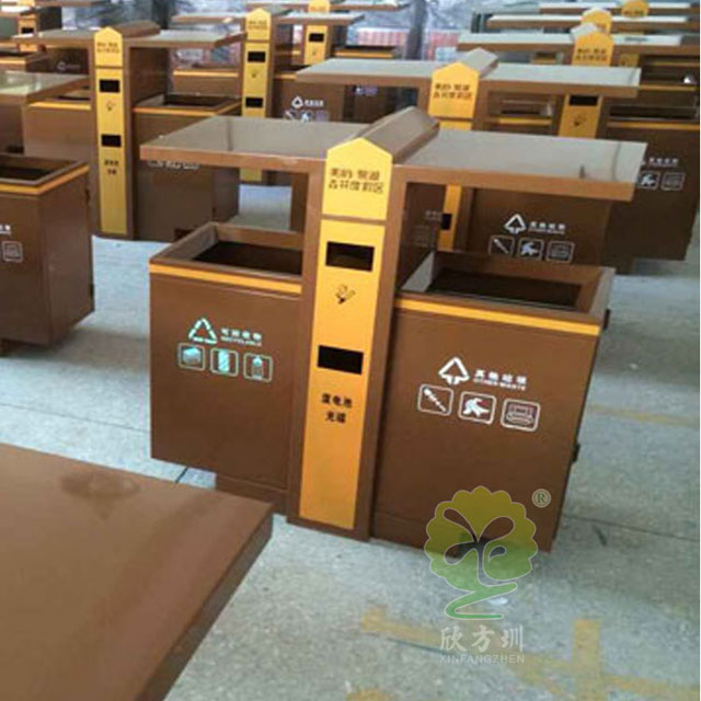 鋼板仿木公園垃圾桶采用優質冷軋鋼材料(liào)經激光切(qiē)割剪鈑(bǎn)下料、折彎、衝壓、焊接、打磨、等工藝:表麵經過除(chú)油、噴砂防鏽(xiù)處理後,再進行酸洗磷化處理;表麵清理(lǐ)幹燥後整體進行靜電噴塗或烤漆處理,靜電噴塗是經過流水線高溫固化(huà)爐固化後再出爐冷卻,加(jiā)工後的塑粉(fěn)附著力強(qiáng),不易剝落,這樣戶外防鏽效(xiào)果才會好。