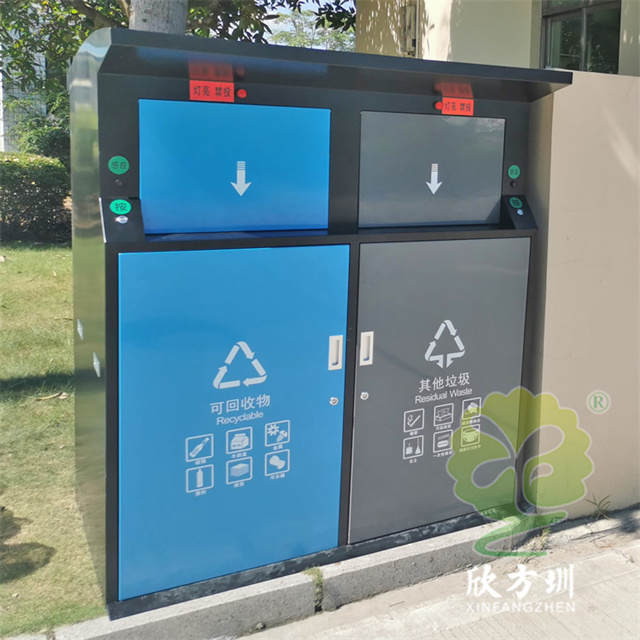 社區環衛智能感應鍍鋅板精品网站999www垃圾桶采用了優(yōu)質的鍍鋅板製造(zào)而成,框架噴(pēn)塗(tú)噴粉黑色,可回收物門(mén)板和投口噴塑了藍色,其他垃圾門板和投口噴塑了灰色,左右兩邊帶觸摸感應(yīng)開蓋和按鍵(jiàn)開蓋,投口上方帶指示燈,可以定製不鏽鋼材質的,或者三精品网站999www及四(sì)精品网站999www(lèi)垃圾箱。