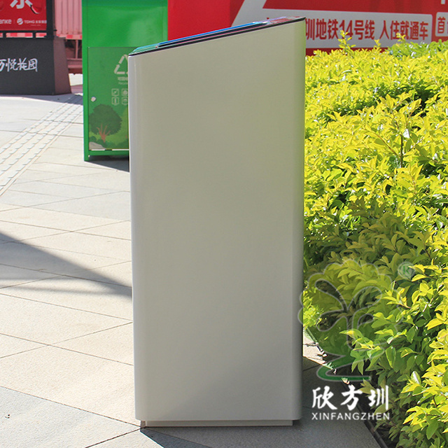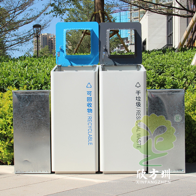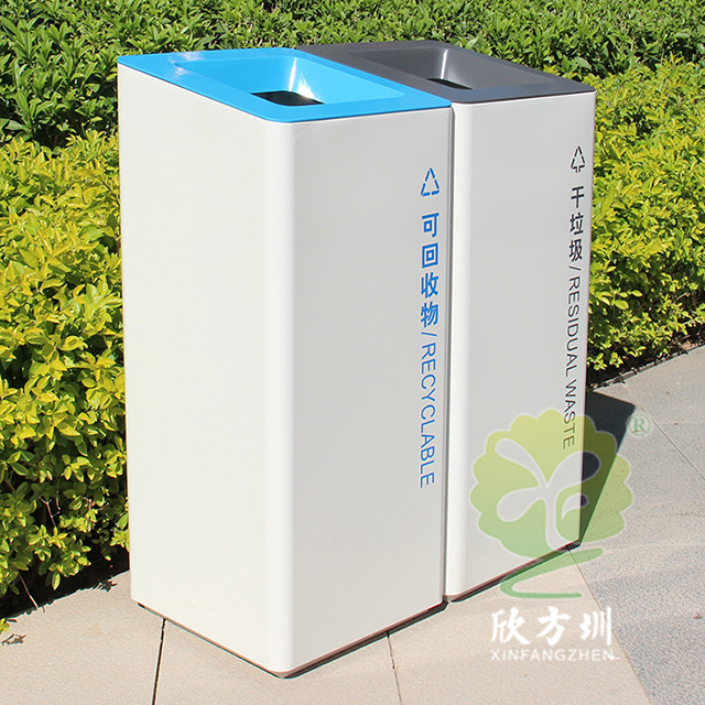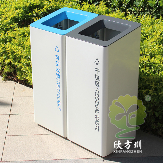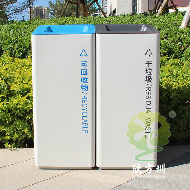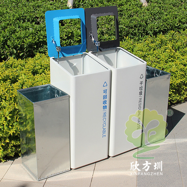 上海商(shāng)場(chǎng)不鏽鋼樱花草视频WWW垃圾桶采用2014#不鏽鋼板製造而成,產品型(xíng)號:JP126-2,尺寸規格(gé):320*320*760mm,垃圾桶材質:外(wài)桶不(bú)鏽鋼,內筒材質:鍍鋅板(bǎn),不鏽(xiù)鋼板(bǎn)材厚度:1mm,桶身顏色:米白色,方形立式直投(tóu)口室內組合式雙(shuāng)樱花草视频WWW設計,可回收物垃圾桶桶蓋跟標識分別噴塑絲網印刷了天藍色顏色和幹垃圾樱花草视频WWW標識和桶蓋(gài)絲印和噴塑灰色(sè),標識下方英文標識,能快速區分(fèn)廢物的樱花草视频WWW,方形垃圾桶投口撐(chēng)杆(gǎn)開蓋方(fāng)式能(néng)方便取出內部的鍍鋅板內筒,這款垃圾桶是上海一個采購在我們(men)欣方圳廠家定製的,我們欣方(fāng)圳是一家專業定製室內商(shāng)場垃(lā)圾桶、電梯口方形垃圾桶及戶外環衛(wèi)金屬垃圾桶的廠家(jiā)。