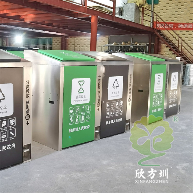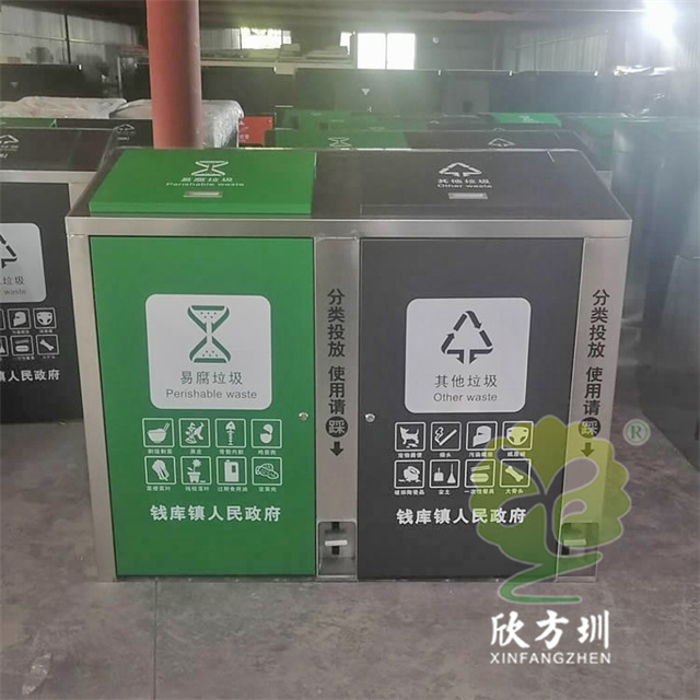 戶外小區腳踏式兩連體不鏽鋼垃圾(jī)桶桶(tǒng)身優(yōu)質201#不鏽鋼足0.95mm厚度(dù)的板生(shēng)產,框架不鏽(xiù)鋼本(běn)色,易腐垃圾門(mén)板和蓋子噴塑綠色,其他垃圾門板和蓋子噴塑黑色(sè),蓋子帶嵌入式扣手,兩連體樱花草视频WWW方(fāng)形設計帶腳踏式,門板采(cǎi)用白色的油墨絲(sī)印了最新國標樱花草视频WWW標識,腳踏式(shì)上方絲印了黑色文字指引。