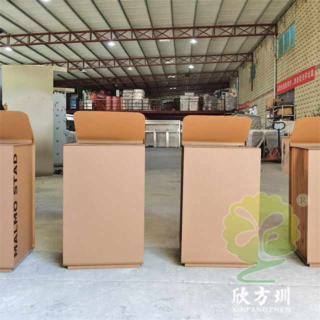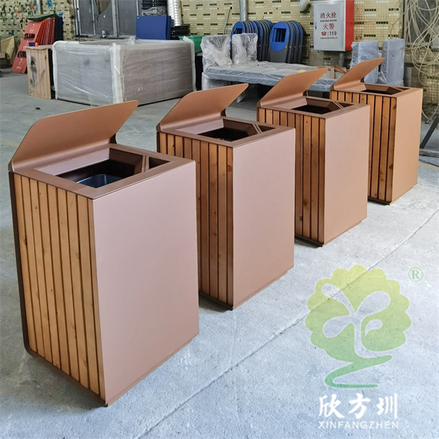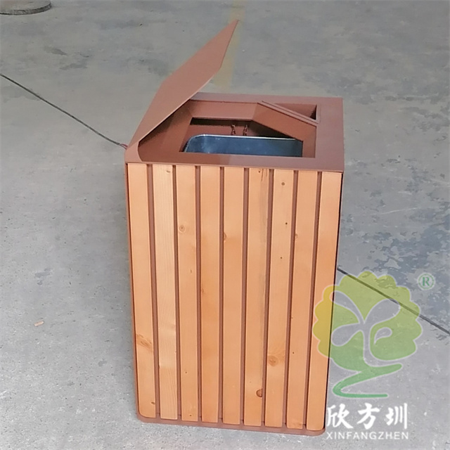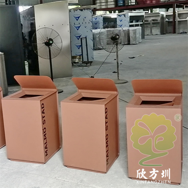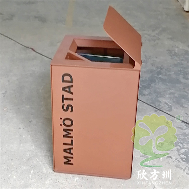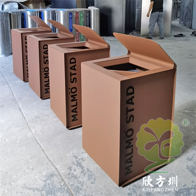戶外(wài)貿易方形不(bú)鏽鋼果皮箱單筒(tǒng)用201#不鏽鋼1.0厚度板生(shēng)產,蓋子2.5mm厚度不鏽鋼板製作,蓋(gài)子坡麵擋雨棚,外框噴塑烤(kǎo)漆巧克力色,正麵的細(xì)紋不(bú)印了(le),用戶要求做純色即可,左右側做了凹進去的效果(guǒ),左側嵌入木條,右側金屬麵黑色油墨英文(wén)字母絲印(yìn)。