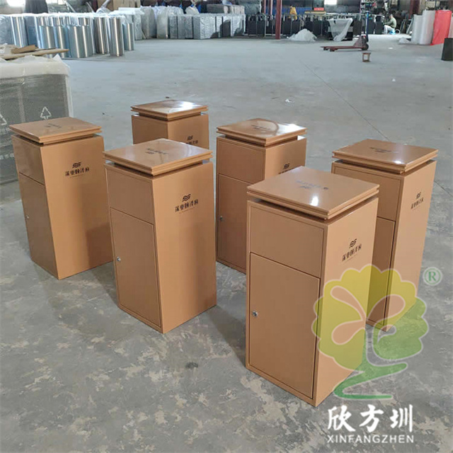 室內淺黃色電梯(tī)口方形不(bú)鏽鋼垃(lā)圾桶這款果皮箱框架采用了優質的201不鏽鋼板製造而(ér)成,此款垃圾桶跟C413外觀差不多(duō),就是開門(mén)方式不一樣,絲網印刷了人頭標和企業名稱文字(zì),背後三角鑰匙開門可以取出桶內的內筒,外框表麵噴塗(tú)噴塑淺黃色,表麵(miàn)可做金(jīn)屬(shǔ)本色或者電鍍以及噴塑其他顏色。