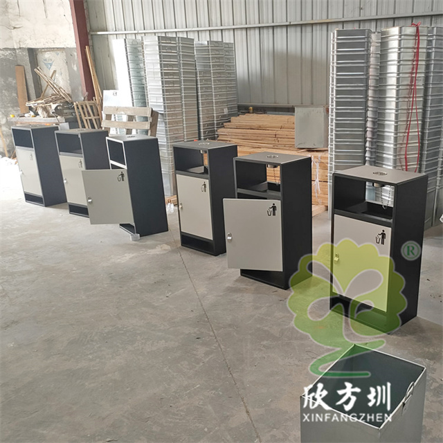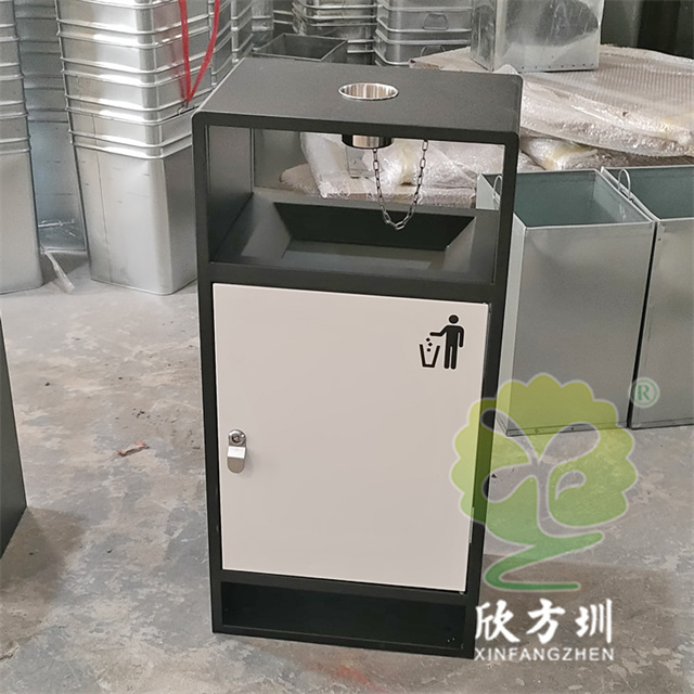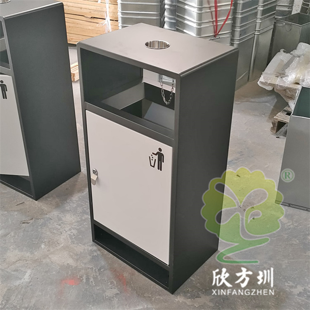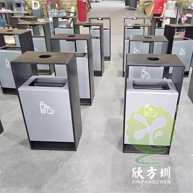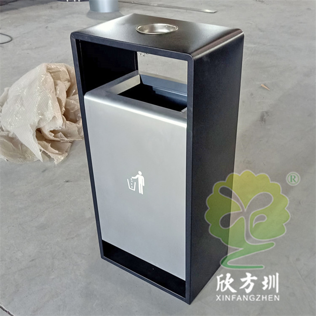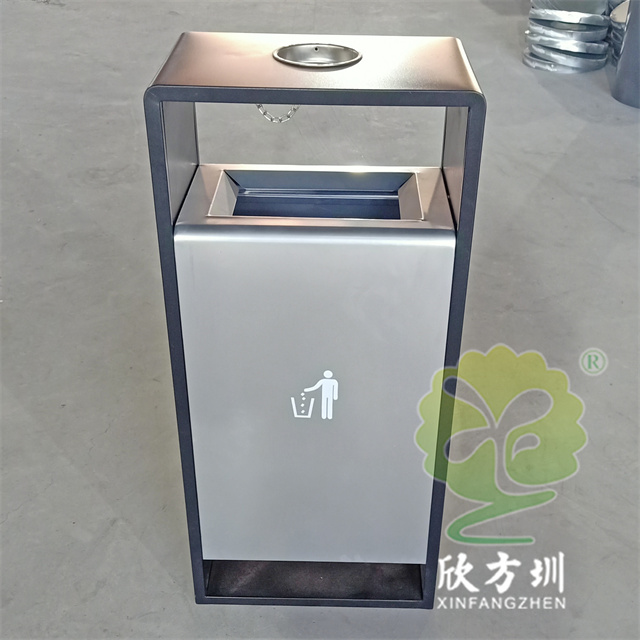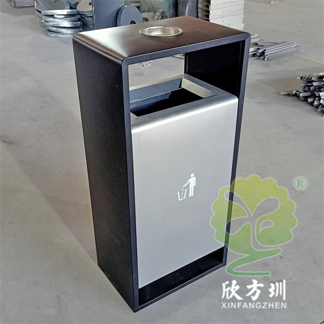户外小区简易方形喷塑不锈(xiù)钢垃圾桶可以选用不(bú)锈钢或者镀锌板制作,这款果皮箱(xiāng)框架(jià)喷涂黑色塑(sù)粉(fěn)桶身喷塑银色,表面可以根据用户要(yào)求定制,顶部中心位置带圆形的烟灰盅,投口带折边,桶身离地(dì)面比较高也有效避免雨水(shuǐ)进入,可以丝印logo人头(tóu)标或分类标识。