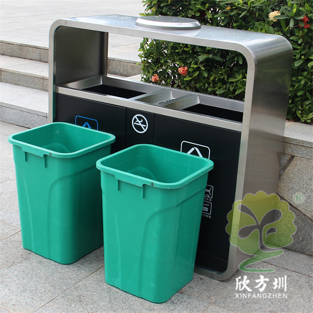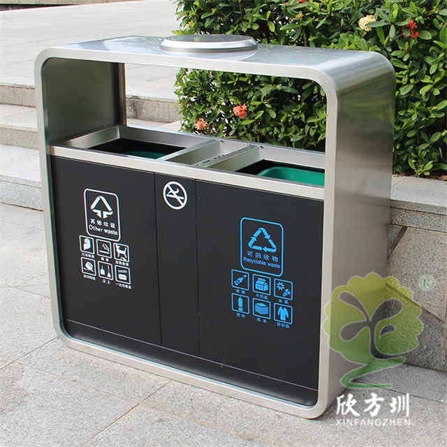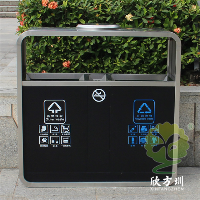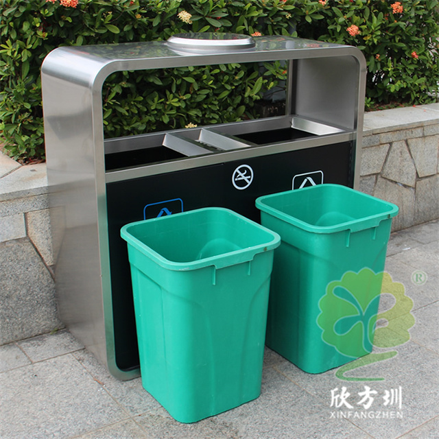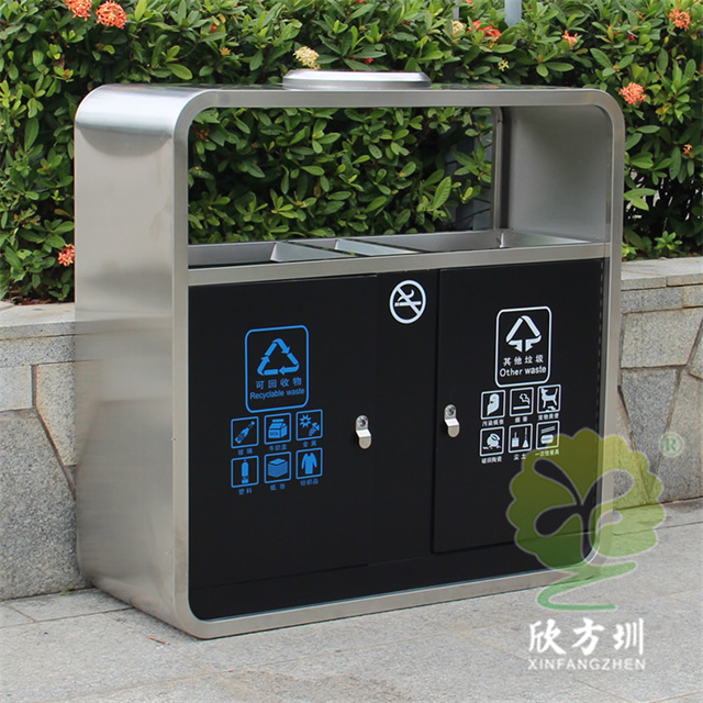 戶外市(shì)政街道不鏽鋼分(fèn)類垃圾桶可以采用201不(bú)鏽鋼(gāng)或者304不鏽鋼板(bǎn)製造(zào),頂部(bù)中心位置凸起(qǐ)出是這款桶創意方形(xíng)兩連(lián)體(tǐ)設計,正反(fǎn)麵油墨(mò)絲網印刷最新國標樱花草视频WWW標(biāo)識和禁煙標識,側麵可以定製絲印企業logo,垃圾桶兩(liǎng)個(gè)方形投口中間位置帶滅煙(yān)盒(hé),帶三角鑰匙(shí)開門方便環衛工人清(qīng)理內置廢物。