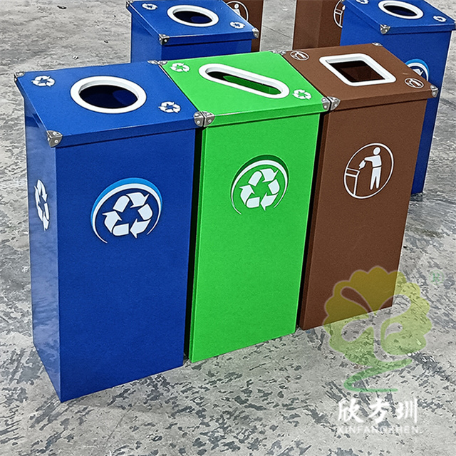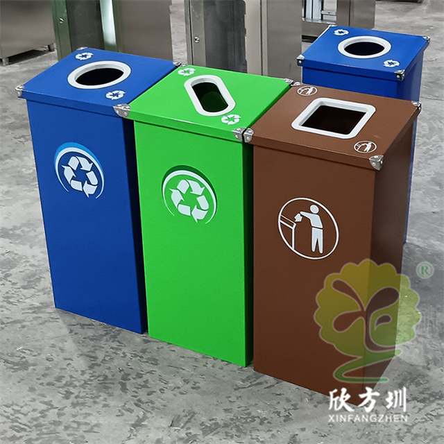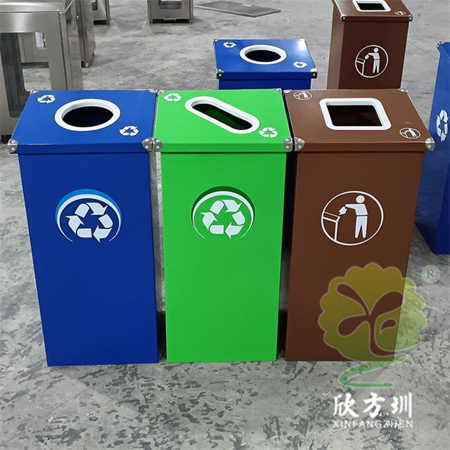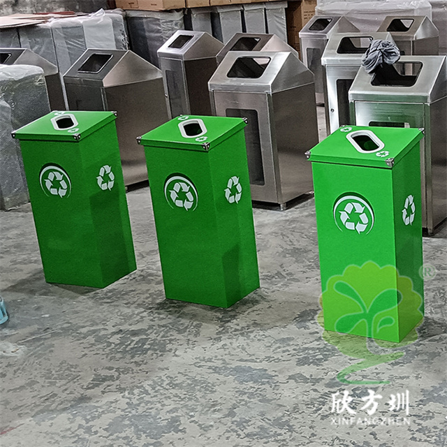 廣東烤漆三色不鏽鋼樱花草视频WWW垃圾桶投放點可(kě)以采用鍍鋅板、201/304不鏽(xiù)鋼製造,方形組合式立式直投口(kǒu)設計,噴粉烤(kǎo)漆綠色、藍色和(hé)咖啡色,投口圓(yuán)形、橢圓形、方形開口,蓋子四角(jiǎo)帶鉚釘裝飾,可以做固定支架,桶身正麵和投(tóu)口邊可以定製油墨絲網印(yìn)刷(shuā)中英文標識和(hé)人頭標。