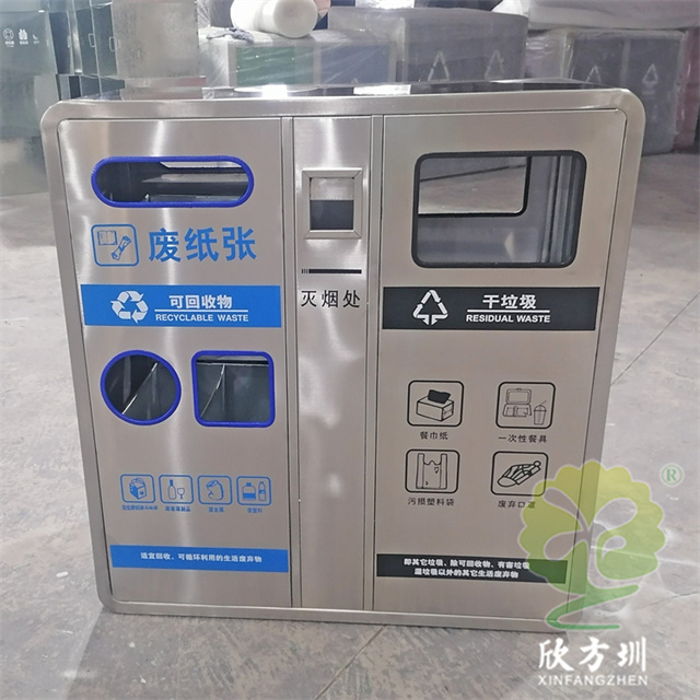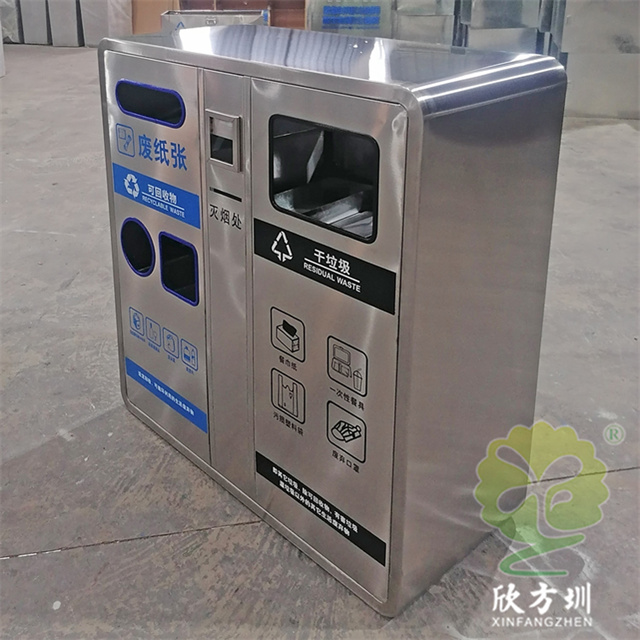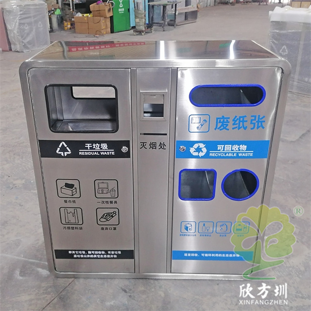 戶外大(dà)容量城市街道不鏽(xiù)鋼樱花草视频WWW垃圾桶可以采用201/304不鏽鋼板製造,表麵烤漆噴塑了就可以做鍍鋅板材質的(de),雙麵可回(huí)收物多個投口設計,有長方形(xíng)廢報紙、方(fāng)形投口、圓形塑料瓶投口,方形幹垃圾投口,投口膠條(tiáo)封邊防止割手,中間位置帶滅煙盒,投口顏色可以定製。