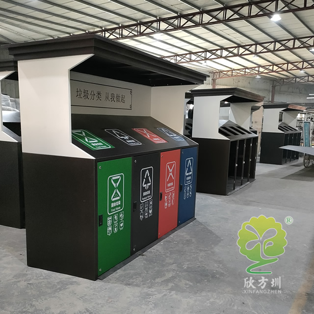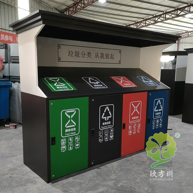 城市道(dào)路小區鍍鋅板四樱花草视频WWW垃(lā)圾亭采用了鍍鋅板製作而成,四樱花草视频WWW屋(wū)形設計,桶身采用了噴塑黑白配色,桶蓋和門板四色(sè)噴塑分別廚餘垃圾綠(lǜ)色噴塑、其他垃圾黑色噴塑、有害垃圾紅色噴塑、可回收物藍色噴塑,桶蓋和門板油墨(mò)絲網印刷了最新的國(guó)標樱花草视频WWW標識,正麵亭(tíng)子中心印刷了垃圾樱花草视频WWW從我做起。