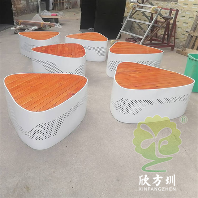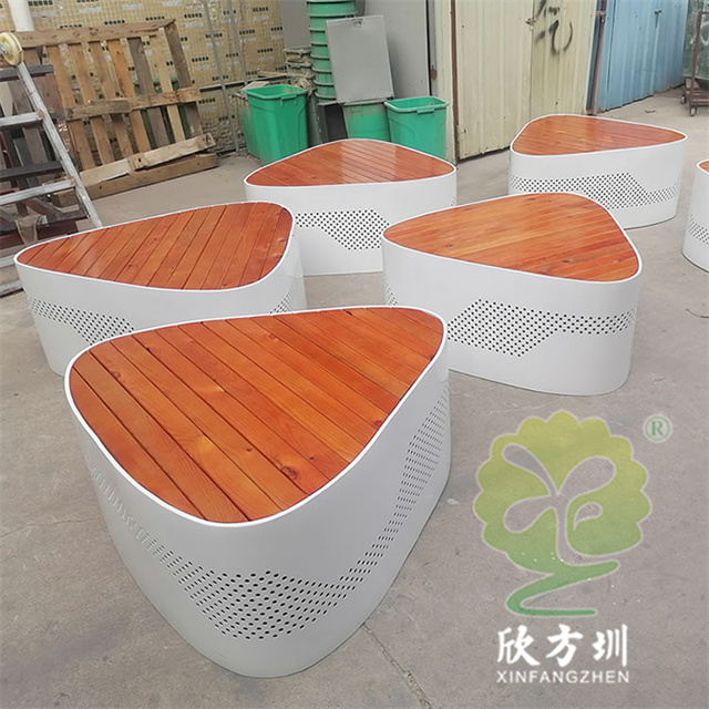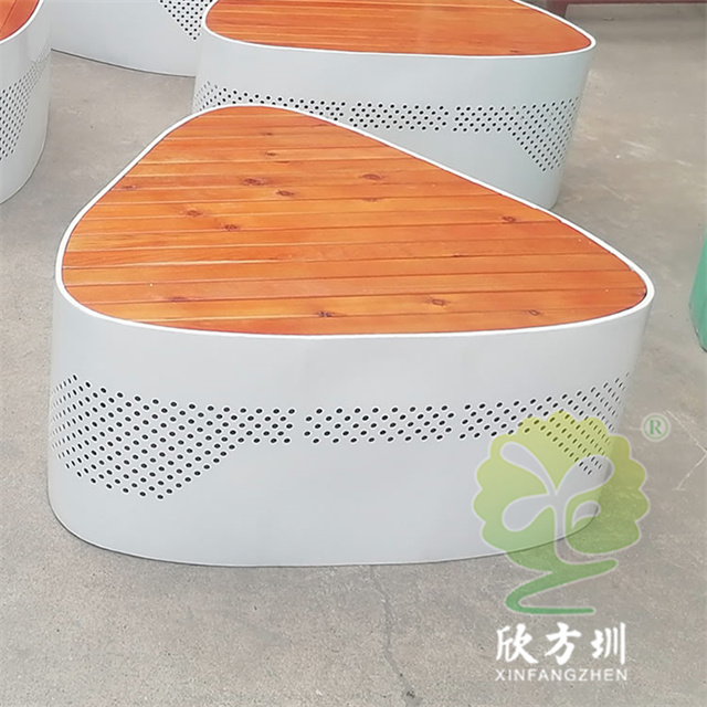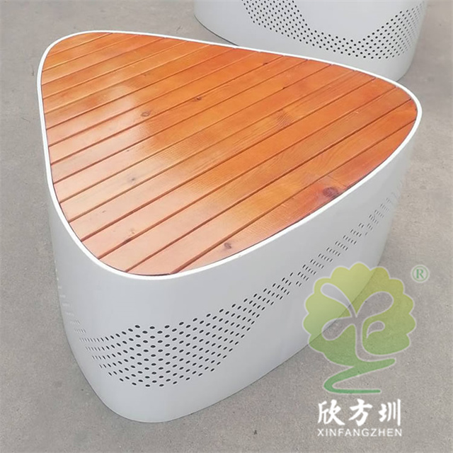 戶外三角形烤漆鏤空不鏽鋼防腐木園林椅坐凳
